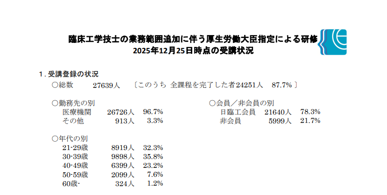 日本臨床工学技士会が、業務範囲追加に伴う研修(厚生労働大臣指定)について、受講登録数・修了状況をまとめた資料(PDF)を公開しています。