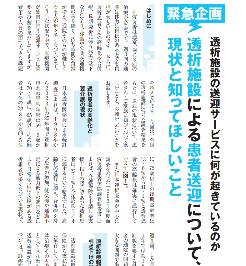 最近、送迎の担い手不足・費用・事故リスクなどが社会的にも論点化しやすく、透析現場の運営に直結するテーマです