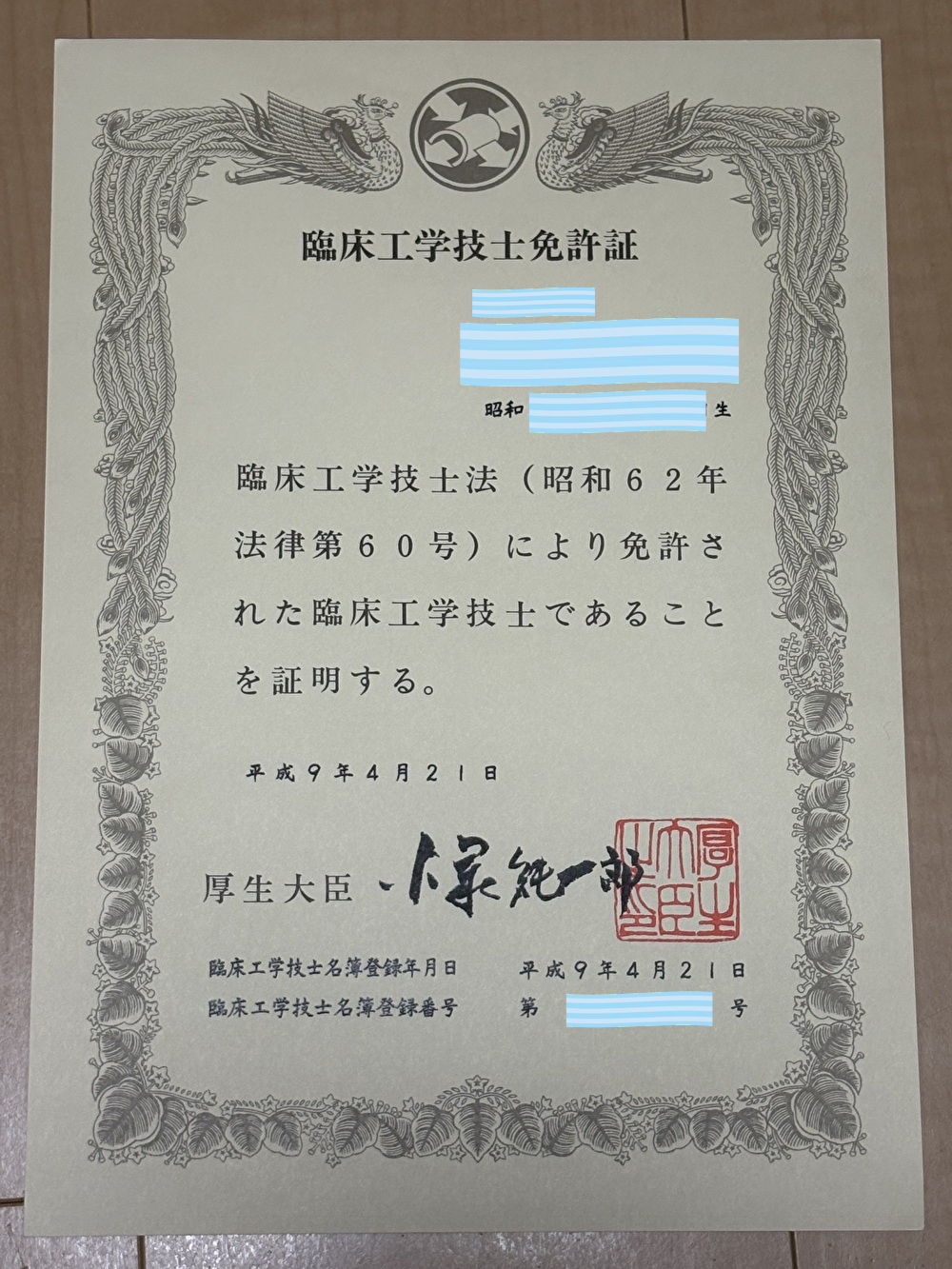 臨床工学技士免許証